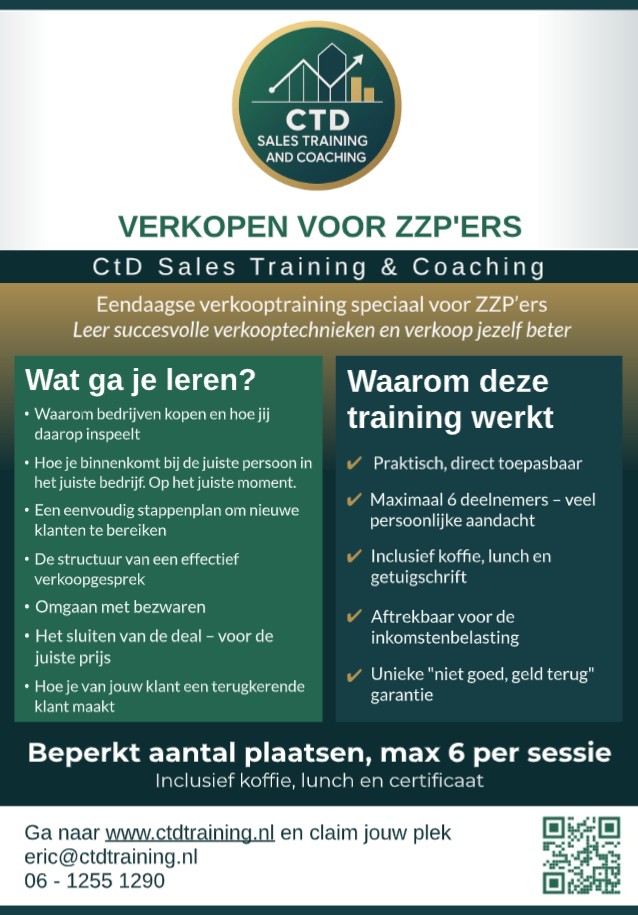 In deze eendaagse klassikale training helpen we jou als ZZP-er jouw klantenkring op te bouwen en op een professionele manier jouw diensten te verkopen.